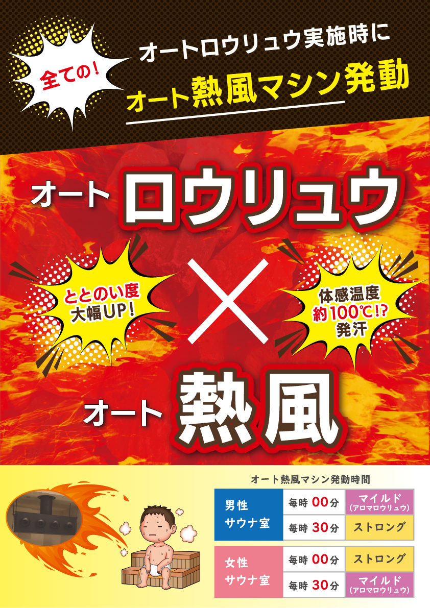 ロウリュウサウナとは、サウナの本場フィンランドに伝わるサウナ入浴法のひとつです。熱せられたサウナストーンに水をかけて発生した蒸気(ロウリュウ)によって発汗を促すものです。当館では、毎時間の定刻に自動でロウリュウを発生させ、充分かつ安定した発汗を楽しむものです。