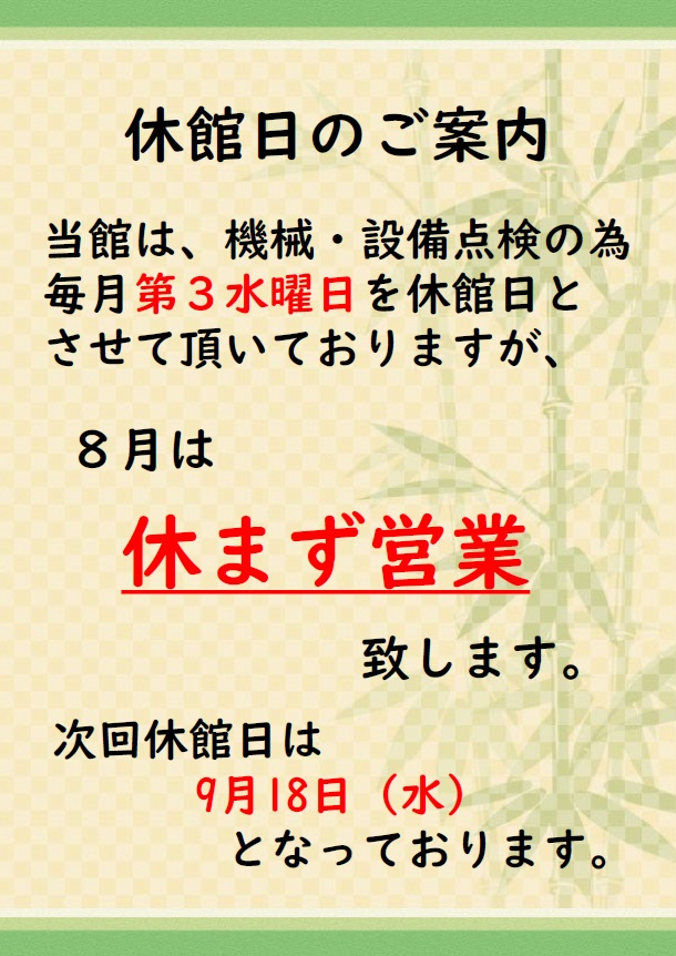 いつもご利用ありがとうございます。 お盆期間8/10(土)~18(日)は、特定日料金とさせていただきます。 大人入館 900円 小学生・幼児の料金は土日祝日料金となります。 また、期間中の貸し部屋・ランニングステーションのご利用は休止させていただきます。
